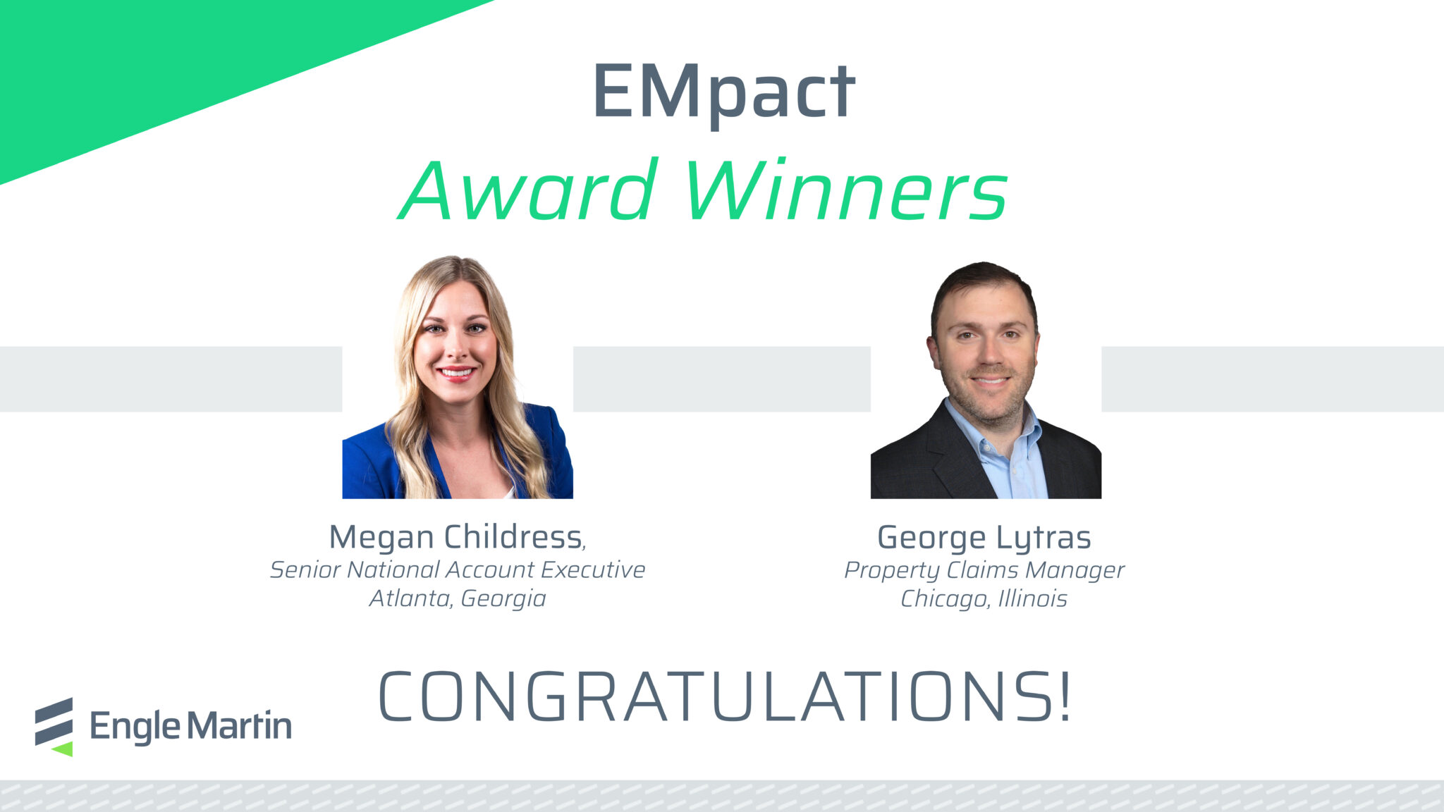 Engle Martin is excited to announce the newest winners of our EMpact Award, Megan Childress and George Lytras. One of our core values is the commitment to recognize and celebrate the value of everyone’s contribution. This peer-nominated award acknowledges individual performance, leadership qualities, and positive influence to our organization.