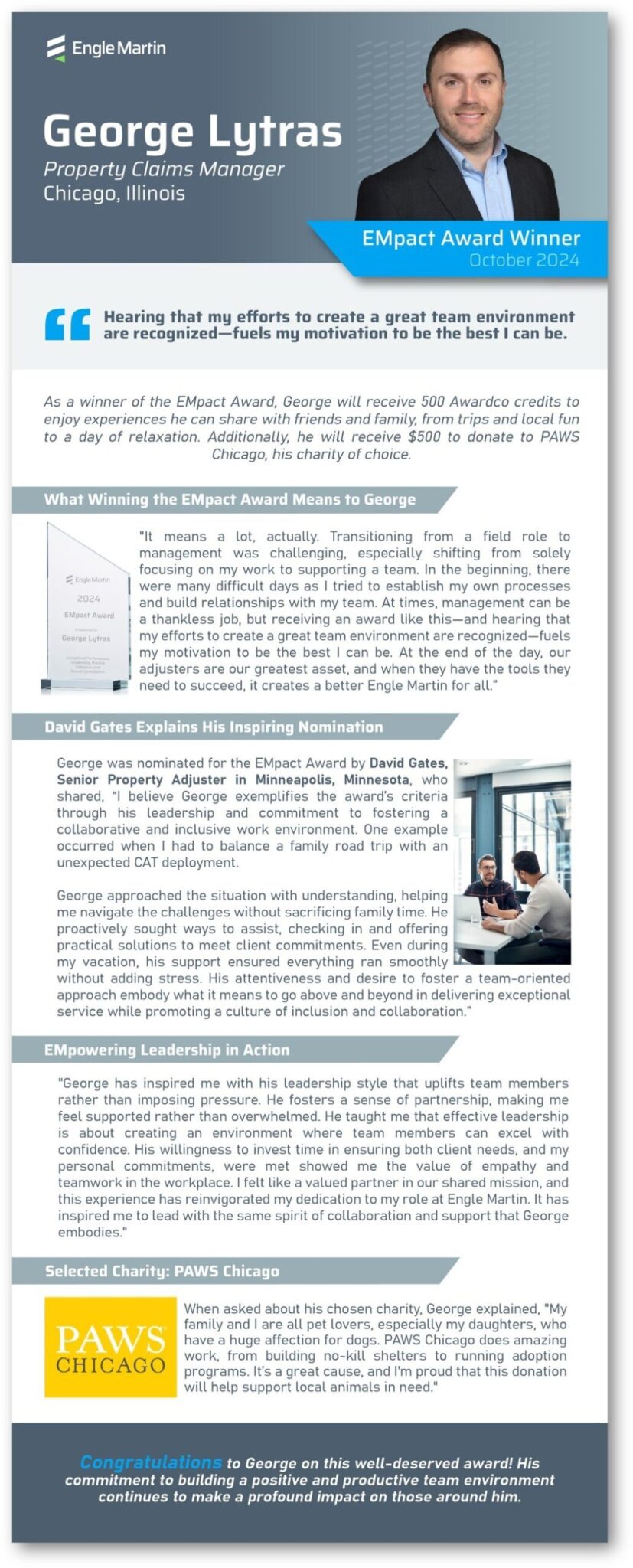George’s peers also had many great things to say about why he is deserving of this honor, stating “George has inspired me with his leadership style that uplifts team members rather than imposing pressure. He taught me that effective leadership is about creating an environment where team members can excel with confidence.”